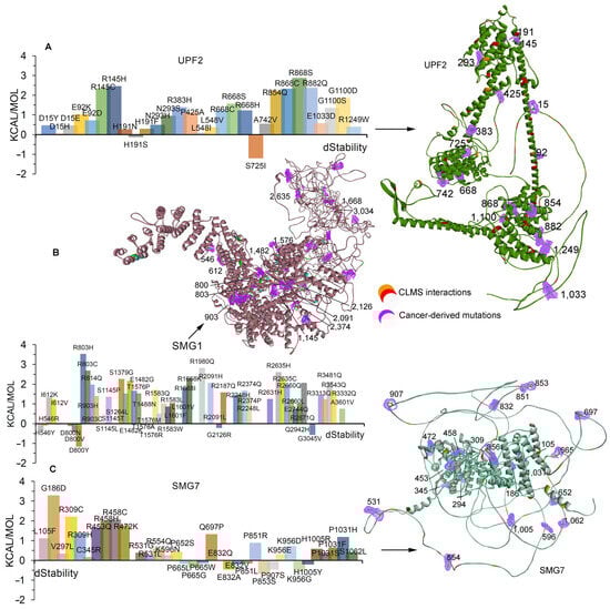 Considering the crucial role of the NMD pathway in degrading mRNA containing PTCs and its involvement in different cancer types, we retrieved a dataset of cancer-derived mutational landscapes from cBioPortal [38] and COSMIC [39] databases and compared them with the cross-linked MS-identified PPIs between the SMG1, UPF2, and SMG7 genes (Figure 5). Several sites of PPIs mutated in different cancer types were revealed (Figure 5) when comparing the cross-linked identified proteins and cancer mutations. For the UPF2 protein, several variants retrieved from cBioPortal [38] and COSMIC [39] were found to be interacting with SMG1 or SMG7. In particular, the 1–170, 215–400, 485–510, 640–735, 900–1000, and 1100–1271 amino acids from the UPF2 were found common in the cross-linking MS experiments and cancer-derived mutations. Similarly, the residues within the ranges of 1–205, 745–895, 1145–1490, and 3495–3535 from the SMG1 gene interacting with UPF2 or SMG7, and 1–95, 510–570, 644–678, 1010–1050, and 1105–1150 in SMG7 were mutated in different cancers. The overall patient survival status relating to SMG1, UPF2, and SMG7 suggests that there is a substantial decrease in survival for the patients from the altered group (Figure 5B). To investigate their functional impact on the identified cross-linked network proteins, we computed structural stability upon interesting point mutations (coming from the protein–protein interfaces) of their structures (Figure 6).