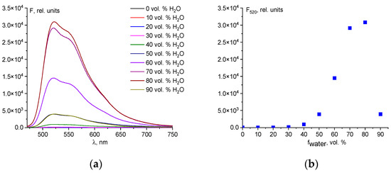 Chemosensor 1 is insoluble in water, but soluble in many organic solvents (acetonitrile, alcohols, DMSO, THF, and DMF). Of these, DMSO is the most suitable for the determination of analytes because it has low toxicity to living organisms and is a high-boiling solvent, which makes it easier to prepare solutions of known concentrations. For these reasons, to select the optimal conditions for the determination of Hg2+ ions, we studied the fluorescence of the mixture 1-Hg2+ in the H2O-DMSO system. Up to a 30 vol.% of water, chemosensor 1 exhibits no reaction with Hg2+ ions, likely due to the strong solvation of the cations by DMSO molecules [42]. Additionally, the opening reaction of the spirolactam ring of fluorescein derivatives occurs most efficiently in aqueous solutions [43]. Optimal fluorimetric conditions for the determination of mercury ions are observed in H2O-DMSO (8:2 v/v) (Figure 1). A sharp decrease in fluorescence intensity at 90 vol.% H2O is caused by aggregation of chemosensor 1.