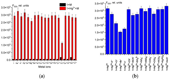 Chemosensor 1 has a substantial affinity towards mercury ions, which renders hydrazone a fitting alternative for detecting Hg2+. Accordingly, the fluorescence response of 1 (50 μM) to Hg2+ ions (1 equiv.) mixed with some other metal ions (1 equiv.) in H2O-DMSO (8:2 v/v) is shown in Figure 3a. As can be seen from Figure 3, fluorescence intensity does not change significantly when 1 equiv. of various metal ions apart from Fe3+ is added to the chemosensor 1 solution. However, Fe3+ ions only interfere with the quantitative recognition of Hg2+ ions. Probably, Hg2+ and Fe3+ ions are competitors for opening the spirolactam ring of chemosensor 1. Therefore, to determine Hg2+ in the presence of Fe3+ ions, it is necessary to mask the iron(III) ions. Fluorides are a suitable masking agent as they form a stable colorless complex [FeF5]2−. Chemosensor 1 exhibits high selectivity for Hg2+ ions, which is not hindered by most of the other metal ions in the H2O-DMSO mixture. Anions have a negligible impact on the fluorimetric detection of Hg2+ ions in solution, except halides such as Cl−, Br−, and I− (Figure 3b). According to the literature, Hg2+ ions can form stable complexes of the composition [HgHaln]2−n with halides [45,46,47]. Such anions as Cl−, Br−, and I− are competing with chemosensor 1 for Hg2+ ions in solution. However, qualitative determination of mercury(II) ions is possible, when Hg2+ ions and halides (Cl−, Br−, or I−) are equimolar in solution.