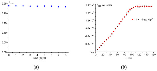 Absorption change at λem = 335 nm of chemosensor 1 (50 µM) at 335 nm during 8 days (a); fluorescence intensity change at λem = 520 nm of mixture 1 (50 µM) + (500 µM) Hg2+ during 160 min (b). Solvent is H2O-DMSO (8:2 v/v). The error bars indicate the random inaccuracy for the three experiments.