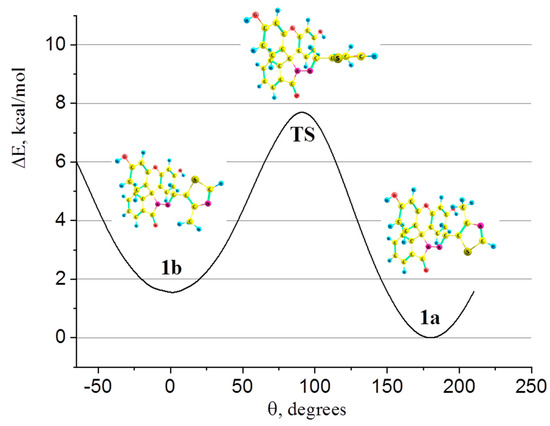 where is the relative Gibbs energy of the conformer. So, 1a dominates in equilibrium at RT; its amount is 96 mol. %. The transition from 1a to 1b can be achieved by rotating the thiazole ring around the hydrazone bridge with a barrier of ~7.7 kcal/mol (numbers of atoms correspond to those in the scheme for synthesizing). The potential energy surface profile of such a rotation is depicted in Figure 6; enlarged images of molecular models of 1a, 1b, and transition state (TS), along with their relative energies and contributions, can be found in ESI (Figure S8).