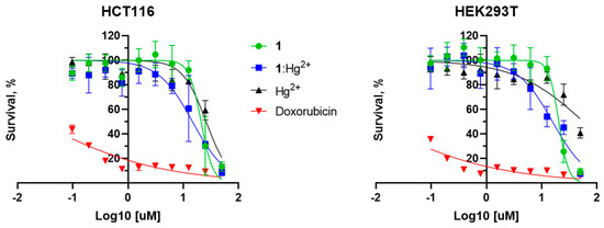 Measurements of cytotoxicity of 1 compound (green) and Hg2+ salt (black), as well as their complex (blue), to human colon carcinoma cells (HCT116) and non-tumor human embryonal kidney cells (HEK293T) after 72 h of incubation. Doxorubicin (red) was taken as a standard for the comparison.