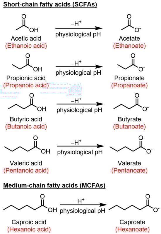 Chemical structures of key SCFAs and caproic acid, and their conjugate base form. Common names given in black, International Union of Pure and Applied Chemistry (IUPAC) naming in red.