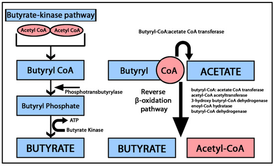 Graphical representation of the butyrate synthesis pathways. In the butyrate kinase pathway, two molecules of acetyl CoA combine to form butyryl CoA. Subsequently, phosphotransbutyrylase catalyzes the conversion of butyryl CoA into butyryl phosphate. Finally, butyrate is generated from butyryl phosphate through the activity of butyrate kinase. The butyryl-CoA: acetate CoA-transferase pathway converts butyryl CoA and acetate by a series of β oxidation enzymatic reactions into butyrate and acetyl CoA [34,35].