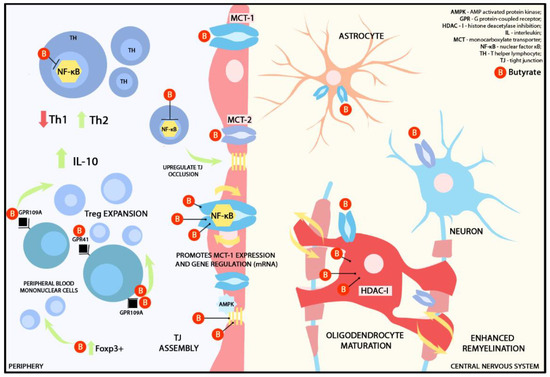 Graphical representation of presumed immunomodulatory effects of butyrate in the periphery and the CNS. MCT-1 receptors are widely distributed across the BBB and CNS cells, such as astrocytes, neurons, and oligodendrocytes, while MCT-2 is primarily located on neurons [56]. MCT-2 exclusively transports butyrate. Butyrate functions as an energy source for MCT-1 in a sodium-dependent manner. Prolonged exposure to butyrate promotes MCT-1 expression via NF-kB and enhances the stability of MCT-1 gene regulation through mRNA [43,44]. Additionally, butyrate acts as HDAC-I on oligodendrocytes, promoting remyelination. At the BBB level, butyrate activates AMPK, which, in turn, upregulates the assembly of TJ. In the periphery, butyrate acts as a Foxp3+ promoter that subsequently induces CD4+ T cell differentiation to a Treg lineage. It also interacts with GPCRs, such as GPR41 and GPR109A, found on the surface of peripheral blood mononuclear cells. Upregulation of GPR109A induces Treg expression and IL-10 secretion. T lymphocytes lack GPCRs that bind to butyrate or any other SCFA; therefore, T lymphocyte modulation is triggered by HDAC-I. Butyrate also supports the synthesis and assembly of TJ [43,69,70].
