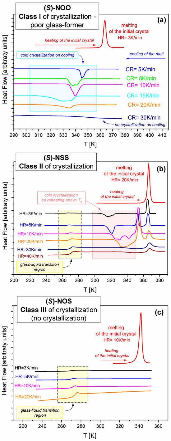 • Class I. For (S)-NOO, crystallization was observed during cooling from the melt (see Figure 1a). It is a poor glass former that requires exceeding a critical cooling rate (~30 K/min) for the successful formation of glass.
