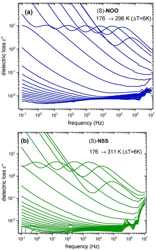To find a potential correlation between molecular mobility and the tendency to crystallize, we performed molecular dynamics investigations of examined materials. For this purpose, we applied broadband dielectric spectroscopy measurements because BDS is an efficient technique for studying molecular mobility over many decades of timescale and at different temperatures and pressures. The selected dielectric spectra for (S)-NOO, (S)-NSS, and (c) (S)-NOS obtained in the wide temperature range during the heating of the samples are presented in Figure 2. As can be seen, all samples in the supercooled liquid state revealed well-separated α-relaxation, which is the dominant relaxation process at temperatures T > Tg. This relaxation is related to the liquid-glass transition and reflects the cooperative and correlated motions of many molecules together. It is often believed that this global relaxation may have a key impact on recrystallization from a supercooled liquid and glassy state. As can be observed in Figure 2, when materials are heated, the α-relaxation peak shifts to higher frequencies for all examined compounds. This indicates that their global molecular mobility increases. By analyzing structural relaxation in dielectric spectra, we can also identify the beginning of the cold crystallization process. As can be seen in Figure 2a,b for (S)-NOO and (S)-NSS, respectively, the amplitude of the α-process (i.e., the dielectric strength Δεα), proportional to the total amount of relaxing units participating in the structural relaxation, began to decrease at given temperatures on heating of samples. The decline in Δεα (T) was attributed to the initiation of cold crystallization and indicated the increasing degree of crystallinity in the samples. For the non-crystallizing (S)-NOS, we did not observe such a phenomenon of Δεα drop, and the magnitude of the α-relaxation peaks for this compound were almost constant during heating.
