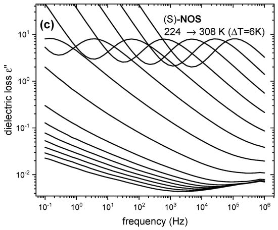 Figure 2. Results of the BDS measurements for the examined materials in the supercooled liquid state obtained during heating from the glassy state: (a) dielectric spectra for (S)-NOO, (b) for (S)-NSS, and (c) for (S)-NOS.