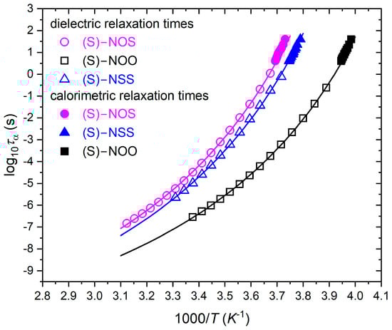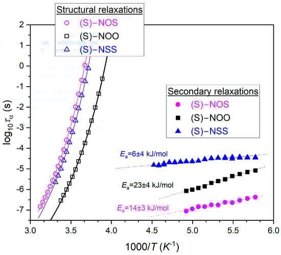 Figure 3. Temperature dependencies of structural and secondary relaxation times for (S)-NOS (magenta circles), (S)-NOO (black squares), and for (S)-NSS (blue triangles), as well as their fits to the VFT equation given by Equation (3) (structural relaxations), and to the Arrhenius law (secondary relaxations).