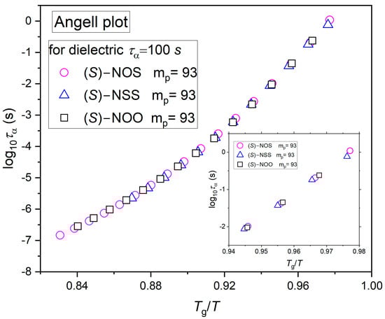 The steepness index m of different materials can be graphically represented using the Angell plot [17] using either experimental structural relaxation times or viscosity data. In this plot, the logarithm of the α-relaxation times log10(τα) or viscosity log10(η) is plotted versus Tg/T. Tg is usually defined as the temperature at which the structural relaxation time equals 100 s, or at which the viscosity reaches 1012 Pa s. As a result, all curves meet at the same point at Tg/T = 1. Based on the Angell plot, the value of m is measured as the slope of log10(τα) or log10(η) plotted versus Tg/T, evaluated at Tg. To verify the obtained equality of the fragility values for all materials, we have also prepared the so-called Angell plot, which is only based on experimentally determined structural relaxation times as a function of Tg/T, independent of any fitting model (see Figure 4).