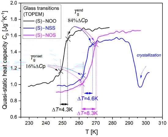 To evaluate thermodynamic fragility using the Moynihan model (Equations (4) and (5)), the width of the glass transition needs to be analyzed. Comparing the obtained dependencies (Cp(T)), one can observe that the width of the glass transition is much larger for (S)-NOS, which does not reveal any tendency to crystallize, than those for the easily crystallizing compounds, (S)-NOO and (S)-NSS. We assumed the glass transition width ∆T as the temperature interval within which the heat capacity Cp changes from 16% to 84% of the total heat capacity step ∆Cp at Tg. This method was taken from the Donth model, which is often used to evaluate the numbers of dynamically correlated molecules based on the width of the glass-liquid transition [68,69]. The illustration of the estimation of the glass transition width ∆T is presented in Figure 6. Onset of the glass transition T g o n s e t is the temperature at which Cp = 16%∆Cp, whereas the end of the glass transition T g e n d is the temperature at which Cp = 84%∆Cp. We found that the width of the glass transition is the largest ∆T = 8.3 K for the physically stable compound (S)-NOS, while for compounds with a high tendency to crystallize, such as (S)-NSS and (S)-NOO, the width of the glass transition is significantly smaller and equal to ∆T = 4.6 K and ∆T = 4.3 K, respectively. The established values of T g o n s e t and T g e n d , collected in Table 3, were then used to determine the activation enthalpy for structural relaxation ΔH at Tg, which for materials with high physical stability was revealed to be almost half that of crystallizing ones.