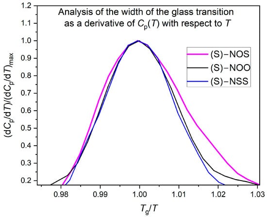 It is worth noting that the assessment of the width of the glass transition does not depend on the method of determining the T g o n s e t and T g e n d values. Analyzing the graph of the derivative of specific heat vs. the scaled temperature Tg/T (see Figure 7), it is visible that the width of the bell curve for the physically stable compound (S)-NOS is larger than those for the crystallizing substances (S)-NOO and (S)-NSS.