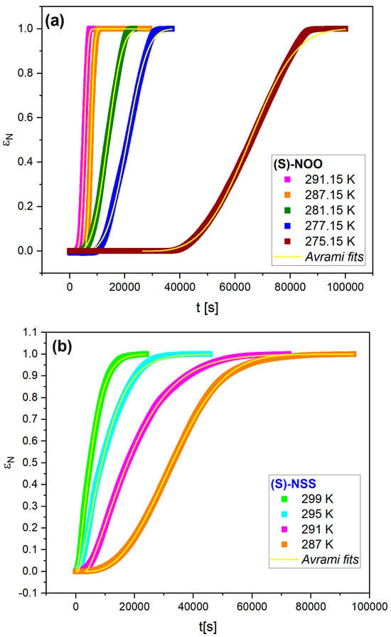 Figure 8. Time dependencies of normalized static permittivity εN(t) for (S)-NOO (a), and (S)-NSS (b). Solid lines represent Avrami fits in terms of Equation (7), with its parameters collected in Table 4.