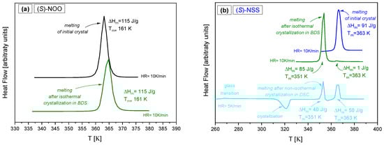 It is worth emphasizing that after measuring the isothermal crystallization kinetics at each temperature, the degree of crystallization and the crystalline form to which the sample transformed from the supercooled liquid state was checked. For both (S)-NOO and (S)-NSS, we confirmed crystallization in the entire sample volume (with an accuracy of 5%). It turned out that after isothermal crystallization kinetics in a supercooled liquid, (S)-NOO returns to the initial crystal form with the same melting temperature and heat of fusion (see Figure 9a), while (S)-NSS is transformed into a more complex polymorphic form (see Figure 9b), consisting of at least two crystalline forms differing in melting temperature. One of them is similar to the initial crystal; it has also been observed under non-isothermal crystallization in the DSC experiment.