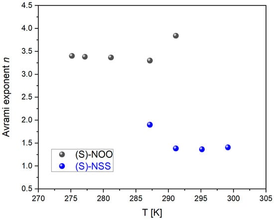 Figure 10. Dependencies of the Avrami exponent n on temperature T for (S)-NOO and (S)-NSS.