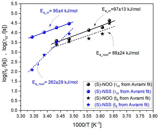 where y is the induction time t0 or the crystallization time τcr = 1/k, y is the timescale in the limit of high temperatures, Ea_x is the activation energy for nucleation or overall crystallization, and the postfix x represents cr or nucl, respectively. As can be seen in Figure 11, one can assume that the parameters t0 and τcr obtained for (S)-NOO and (S)-NSS comply with Equation (8) to a sufficiently good approximation, including t0 for (S)-NSS, despite some deviations from the linear dependence.