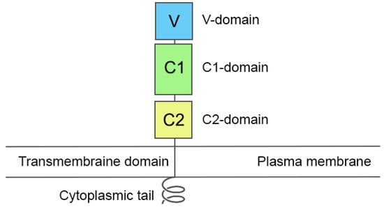 RAGE is a multiligand plasma membrane receptor belonging to the immunoglobulin superfamily. In addition to AGEs, its ligand-binding domain recognizes a huge number of molecules, among which the most important are β-amyloid and macrophage antigen complex-1, HMGB1, and the S100 proteins [11]. A schematic representation of a monomer of RAGE is shown in Figure 1.