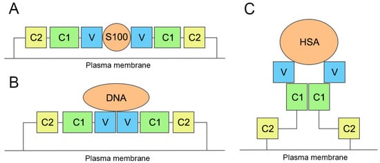 Schematic representation of the RAGE complexes with macromolecular ligands. (A) The complex of the RAGE dimer with S100, compiled on the basis of the experimental structure of the V-domain dimer in complex with S100A6 (PDB entry 2M1K [13]) and its alignment with the experimental structure of the full-length human RAGE extracellular domain (PDB entry 4LP5 [12]). (B) The complex of the RAGE dimer with DNA, compiled on the basis of the experimental structure of the dimer of the VC1-domains in complex with DNA (PDB entry 4OI8 [15]) and its alignment with the experimental structure of the full-length human RAGE extracellular domain (PDB entry 4LP5 [12]). (C) The complex of the RAGE dimer with human albumin (HSA), compiled on the basis of the structure of the RAGE–HSA oligomer proposed by Xie et al. [10].