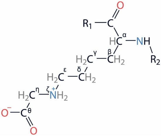 The glycation process mainly targets N-terminal amino acids, the thiol groups of cysteine and the side chains of lysine and arginine. In HSA, glycation at the lysine residues has been studied the most. Moreover, the glycated lysines of lysine-rich proteins (including serum albumin) are markers of age-related pathologies [18]. Carboxymethyl-lysine (Figure 3) is one of the main reagents found in vivo in adducts with albumin [19].