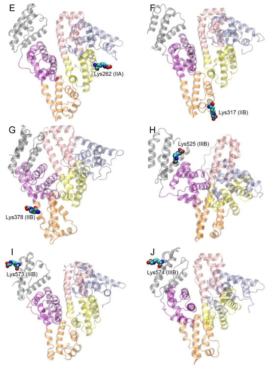 Three-dimensional structures of glycated human serum albumin (gHSA) modified at Lys64 (A), Lys73 (B), Lys137 (C), Lys233 (D), Lys262 (E), Lys317 (F), Lys378 (G), Lys525 (H), Lys573 (I) and Lys574 (J) obtained by molecular modeling. Glycated lysines are represented by colored spheres. The carbon, oxygen, and nitrogen atoms of glycated lysines are shown in cyan, red, and blue, respectively. Domains IA, IB, IIA, IIB, IIIA, and IIIB of gHSA are shown with ice blue, pink, yellow, orange, purple, and black ribbon, respectively. After the glycated lysine number, the gHSA domain to which it belongs is indicated in parentheses.