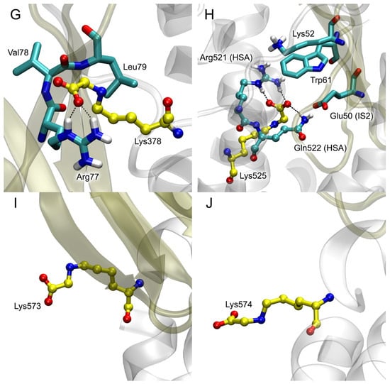 The interaction of RAGE with gHSA glycated at Lys573 is a special case. In the complex obtained by macromolecular docking, CML did not interact with any of the amino acids of the V-domain of RAGE (Figure 5H). However, during the MD simulation, CML moved closer to the Arg29 of IS3 (Figure 7I); the salt bridge between these residues exists for 30 ns of the simulation. Other residues of the ISs are not involved in the interaction with gHSA (Table 3), as there are actually no specific interactions between the molecules. The complex of RAGE with Lys574-glycated HSA is strong, forming more than a hundred short-range contacts between the proteins, including four hydrogen bonds and five salt bridges (Table 3). However, this complex is a nonspecific one, since the CML does not contact with any amino acids of RAGE (Figure 7J). Therefore, even if such an interaction does occur in vivo, it probably does not lead to further signal transmission.
