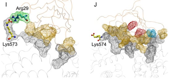 In the cases of the glycation of Lys137 and Lys574, as expected, the gHSA molecule is characterized by an increase in the SASA value (Figure S5C,J). A similar effect, although to a lesser extent, occurs in the RAGE complex with gHSA glycated at Lys573 (Figure S5I), in which the V-domain also interacts with domains IB and IIIB of gHSA (Figure 6I). This is also likely due to the movement of domains IB and IIIB relative to each other. It is also interesting to note the increase in the SASA in the case of glycated Lys378 (Figure S5G). We believe this may be due to the fact that in this complex RAGE interacts with some amino acids of domain IIIA (namely, Gln385, Pro441, Glu442, Met446, Table 3), which can affect the conformation of domain IIIB (its susceptibility to external influences has been already mentioned in this section and in Section 2.2). For other lysines, the interaction of gHSA with RAGE does not significantly change the value of albumin’s SASA (Figure S5A,B,D–F,H).