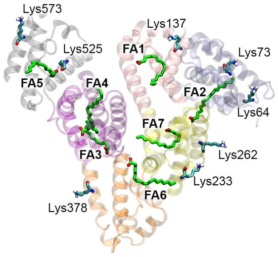 Albumin is the main transport protein for the transfer of fatty acids (FAs) throughout the vascular bed [27]. Using X-ray analysis, it was shown that there are seven main FA binding sites in the albumin molecule: FA1 (domain IB), FA2 (domains IB and IIA), FA3 (domain IIIA), FA4 (domain IIIA), FA5 (domain IIIB), FA6 (domains IIA and IIB), and FA7 (domain IIA) [27]. According to the literature, FA5 is the highest-affinity FA-binding site [28]. The total concentration of major FAs in the blood of humans can reach 100 μM, that is, their concentration is comparable to the concentration of HSA. It is known that FA binding affects the interaction of albumin with the ligands of sites Sudlow I and II [29,30]. As part of our studies on the integrative role of albumin, we questioned whether FA binding could influence the glycation of albumin, and vice versa. Figure 8 shows the HSA molecule with seven molecules of oleic acid (OLA, one of four major FAs) bound in sites FA1–7 (PDB entry 1GNI [31]), and eight lysine residues highlighted that play a key role in the binding of gHSA to RAGE according to the results presented in the previous sections.