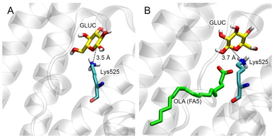 We performed molecular docking of β-D-glucopyranose (GLUC) near the Lys525 of HSA. Two models of albumin were used for docking: (1) free HSA and (2) HSA with an OLA molecule bound in site FA5 (Figure 9). The α- and β-anomers of glucose are in equilibrium, passing into each other through the acyclic form. The β-anomer was chosen due to the fact that the equilibrium is shifted toward this anomer. When glucose interacts with lysine, a nucleophilic attack occurs by the lysine side chain nitrogen atom (Nζ) on atom C1 of glucose (according to the standard numbering of the International Union of Pure and Applied Chemistry, IUPAC). In the HSA–GLUC complexes obtained by molecular docking, the glucose molecule binds near the amino acids Glu518, Arg521 and Glu556, which form a site different from site FA5. In the OLA-free HSA–GLUC complex, the distance between atom C1 of glucose and atom Nζ of Lys525 is 3.5 Å (Figure 9A), while in the HSA–GLUC complex with the OLA molecule it is 3.7 Å (Figure 9B). In both cases, the distance is sufficient for the nucleophilic attack of nitrogen Nζ on carbon C1. In both complexes, the estimated free energy of the binding of glucose to albumin (ΔG) is −3.8 kcal/mol. Based on the totality of all the above results, we believe that the OLA molecule bound in site FA5 apparently does not affect the possibility for glycation of Lys525.