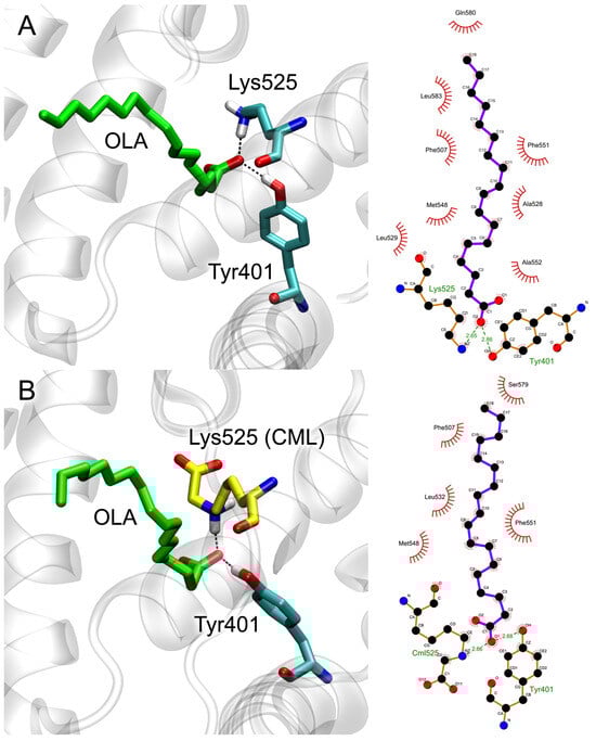 On the other hand, the modified Lys525 turning into CML acquires a negatively charged group, which logically does not contribute to the binding of the OLA molecule, which also has a negatively charged group in its structure. To confirm this assumption, we applied the method of MD to study the conformational changes in native and Lys525-glycated HSA with an OLA molecule bound at site FA5. The conformation of the OLA molecule after 100 ns of MD simulation is shown in Figure 10 in 3D (left) and 2D (right) representations. According to the obtained results, in the case of both native HSA (Figure 10A) and gHSA (Figure 10B), the OLA molecule remains bound in site FA5 throughout the entire simulation. Its carboxyl group interacts with the hydroxyl group of Tyr401 and NH3 group of Lys525 (Figure 10A,B).