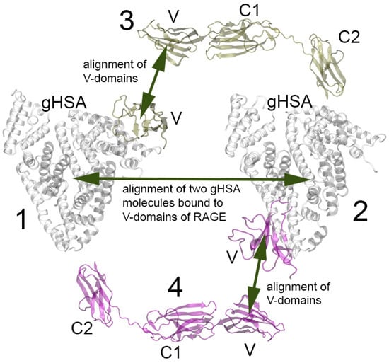 Scheme of the alignment of HSA and RAGE molecules to obtain the structure of the dimers. Symbols 1 and 2 indicate complexes of gHSA with the V-domain of RAGE, obtained in silico in the presented work. Symbols 3 and 4 indicate the structures of RAGE VC1C2-domains obtained experimentally (PDB entry 4LP5, chain A [12]). The symbols V, C1 and C2 indicate the V-, C1- and C2-domains of RAGE, respectively.