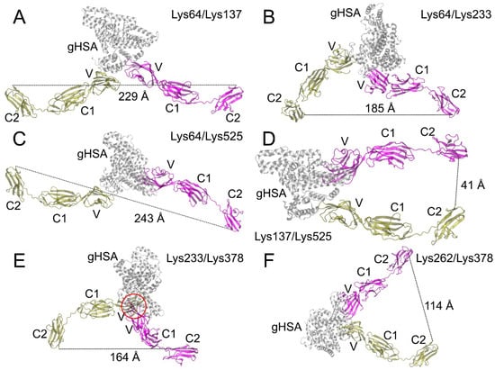 At the next stage, on the basis of the gHSA–V complexes described in Section 2.4 (Figure 6), in a pilot experiment we attempted to construct the possible structures of the RAGE–gHSA dimers. As noted in Section 2.4, specific RAGE complexes with gHSA glycated at Lys317 and Lys574 were not formed. Therefore, we excluded Lys317 and Lys574 from the list of candidate monomers for the formation of dimers. The complex of the V-domain with Lys73-glycated gHSA, according to the MD simulation, takes the conformation in which albumin contacts the “forbidden” region of RAGE (the region of contact of the V- and C1-domains of the receptor). We will study the case of Lys73 further in the future: we will need to include the C1-domain into the model of RAGE for the computational experiment. In the meantime, at the current stage, we also excluded Lys73 and did not consider the complex of RAGE with Lys73-glycated gHSA when constructing the dimers. Thus, complexes of the V-domain with gHSA glycated at Lys64, Lys137, Lys233, Lys262, Lys378, Lys525 and Lys573 were used to construct the dimers. For this purpose, we performed a pairwise alignment of the gHSA–V complexes with the structure of the VC1C2-domains of RAGE obtained experimentally (PDB entry 4LP5, chain A [12]). The alignment diagram is shown in Figure 11.