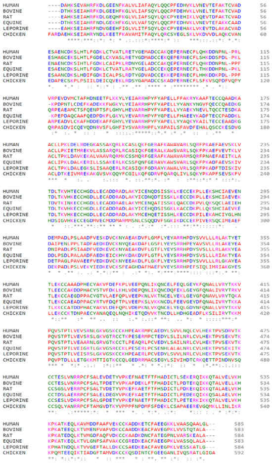 2.7. Comparative Analysis of Primary Sequences of Albumins from Various Species