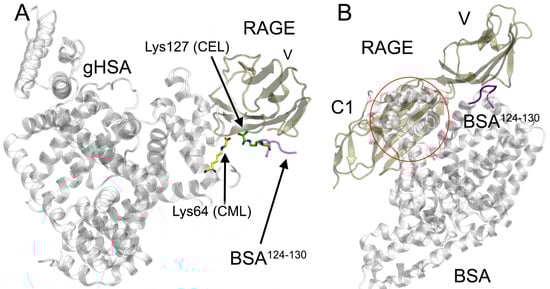 Serum albumin is a major protein in the blood of mammals and some other classes, where its concentration is 500–700 µM. The difference between albumin and other blood proteins is that it is normally not glycated, but due to its high concentration, even a small percentage of gSA makes a significant contribution to the overall level of AGEs. It is known that glycated human albumin (gHSA) can bind to the RAGE of endothelial cells [7,8] and adipocytes [9]. In order to investigate the gSA–RAGE interaction at the molecular level, it is necessary to resolve the three-dimensional structure of the gSA–RAGE complex. This structure has not yet been resolved experimentally. However, sufficient experimental data have been collected on the AGEs’ interaction sites on the RAGE surface [10]. The accumulated information allows the application of molecular modeling methods to construct the gSA–RAGE complexes and determine the molecular basis for the involvement of serum albumin in the AGE/RAGE axis. This, in turn, will inform us about the role of gSA in the pathogenesis of DM and other metabolic disorders.