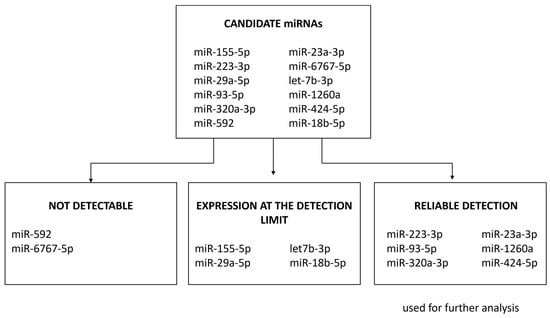 In the case of miRNAs, very low or no concentrations from circulation might be expected [48]. The handling of missing qPCR values from qPCR is therefore another critical point that requires standardization. Failure to distinguish between missing data due to a low concentration or missing data due to randomly occurring technical errors may further partly explain the variation within and between otherwise similar studies. To improve the accuracy and precision of our miRNA data, we applied an adopted practical data handling pipeline [48] and evaluated the investigated candidate miRNAs according to the level of expression into the categories “not detectable”, “at the detection limit” and “reliable detection” (Figure 1). Data reproducibility of miRNA studies is essential prior to clinical applications [49].