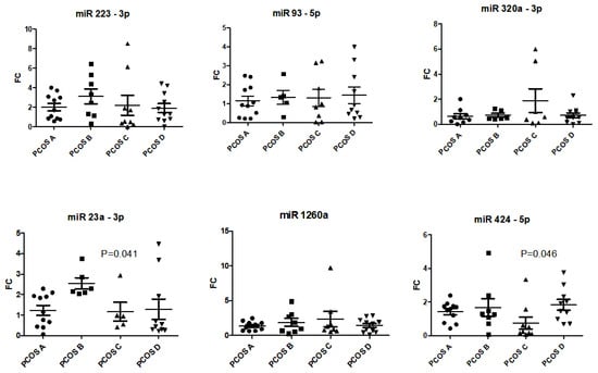 Serum expression of candidate miRNAs in phenotypes with HA (phenotypes A, B, C) and women with PCOS without signs of HA (phenotype D). Data are displayed as scatter plots, where each dot represents the fold change as 2−ΔΔCq of one study sample.