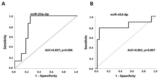 To evaluate the discriminatory potential of miR-23a-3p and miR-424-5p serum expressions in predicting a PCOS phenotype, we performed receiver-operating characteristic (ROC) analysis and calculated the area under the curve (AUC) value. MiR-23a-3p serum expression is a discriminator to differentiate phenotype B from phenotypes A, C and D (AUC = 0.837; 95% confidence interval (CI), 0.706–0.968; p = 0.006). MiR-424-5p discriminates phenotype C from A, B and D (AUC = 0.801; 95%CI, 0.591–1.000; p = 0.007) (Figure 3).