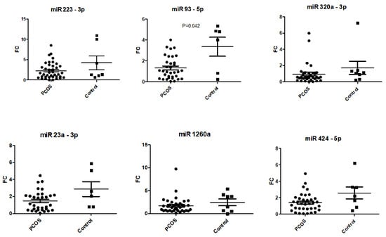 Expression of candidate miRNAs in serum of women with PCOS (all phenotypes) and controls. Data are displayed as scatter plots, where each dot represents the fold change as 2−ΔΔCq of one study sample.