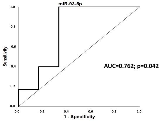 The serum expression of miR-93-5p was downregulated in women with PCOS (all phenotypes) compared to the control group (p = 0.042) (Table 3 and Figure 4). This association did not remain significant after Bonferroni correction for multiple testing. The fold change values of miR-93-5p discriminated women with PCOS from controls (AUC = 0.762; 95%CI, 0.483–1.000; p = 0.042) in the ROC analysis (Figure 5). MiR-223, miR-93-5p, miR-320a-3p, miR-23a-3p, miR-1260 and miR-424-5p showed no group-specific differences in their serum expression (Table 3). Respective scatter plots are shown in Figure 4.
