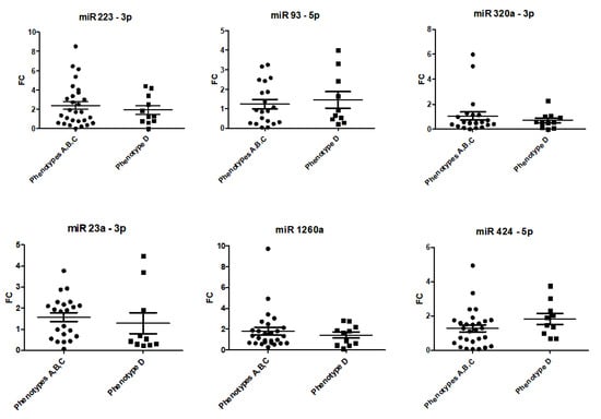 MiR-23a-3p and miR-424-5p showed altered serum expressions in one phenotype compared to the other phenotypes. MiR-23a-3p was significantly upregulated in phenotype B compared to phenotypes A, C and D. MiR-424-5p was significantly downregulated in phenotype C compared to phenotypes A, B and D (Table 2 and Figure 2).