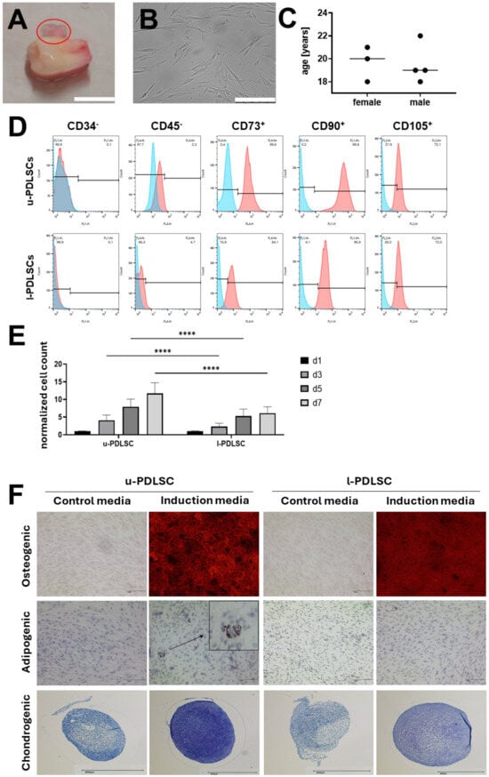 - Mert, S.; Malyaran, H.; Craveiro, R.B.; Wolf, M.; Modabber, A.; Jahnen-Dechent, W.; Neuss, S. Comparative analysis of proliferative and multilineage differentiation potential of human periodontal ligament stem cells from maxillary and mandibular molars. J. Periodontol. 2023, 94, 882–895. [Google Scholar] [CrossRef] [PubMed]