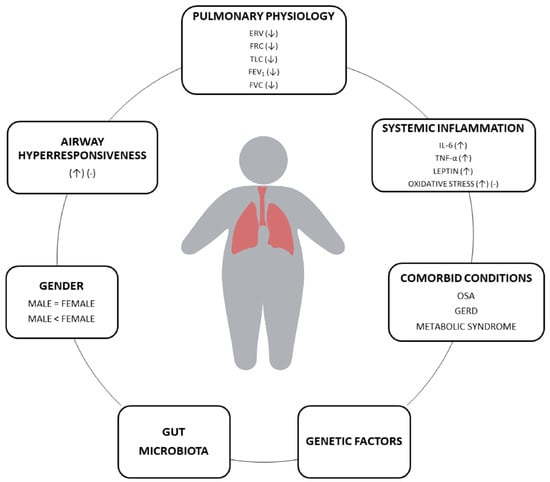 There are many mechanisms that could explain the relationship between asthma and obesity, and the most obvious is the effect of excess abdominal and thoracic adipose tissue on pulmonary physiology. Obesity may cause alterations in the airways that include increased resistance and breathing work, inefficiency of respiratory muscle, decreased respiratory compliance, or modification in gas exchange. The abnormalities observed in obese individuals, the reduction in expiratory reserve volume (ERV), and a correlated decrease in functional residual capacity (FRC) are proportional to increasing BMI []. It was demonstrated that at a BMI = 30 kg/m2, FRC and ERV parameters account for 75% and 47% of the values obtained for patients with a BMI = 20 kg/m2 []. Morbid obesity may be associated with lower total lung capacity (TLC), however, the changes are relatively minor [,]. Some studies also show that obesity is related to reduced forced expiratory volume in 1s (FEV1) and forced vital capacity (FVC) []; in others, the differences between lean and obese asthmatics were only slight []. Both parameters are usually reduced to a similar degree, and consequently, the FEV1–FVC ratio remains unchanged [].