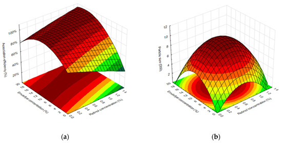 Surface response for (a) association efficiency of Retinol CB 50 within biogenic silica microparticles and (b) particle size.