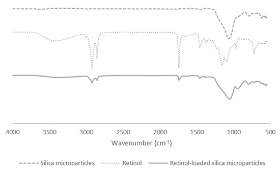 Analysis by Fourier transformation infrared (FTIR) was performed to identify potential physicochemical interactions between retinol and silica. ATR-FTIR analysis was conducted in the absorbance range of 4000 to 400 cm−1 using a Spectrum 100 FTIR spectrometer, (Perkin Elmer, Hopkinton, MA, USA) equipped with an attenuated total reflectance (ATR) accessory (PIKE Technologies, Fitchburg, WI, USA) with a diamond/Se crystal plate.