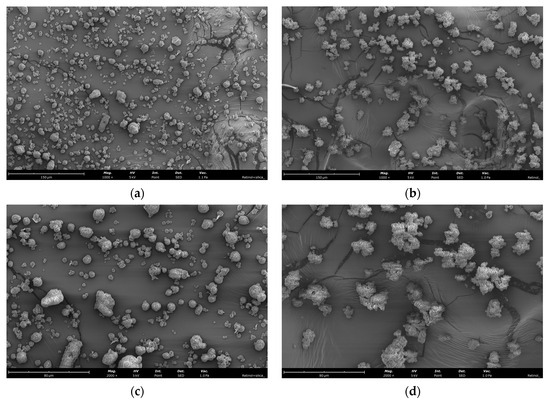 Scanning electron microscopy microparticle analyses were performed on a Phenom XL G2 (Thermo Fischer Scientific, Eindhoven, The Netherlands). Samples were placed on the top of metallic pins covered with double-sided adhesive carbon tape (NEM tape, from Nisshin, Japan) and coated with gold/palladium using a Sputter Coater (Polaron, from Bad Schwalbach, Germany). All observations were performed (and micrographs acquired) in a high vacuum, with an acceleration voltage of 5 kV, using the secondary electron detector (SED).