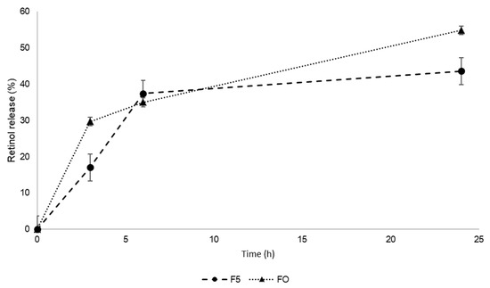 The release profile of retinol from silica particles was studied using Fo and F5 formulations as models, containing 30 and 10 mg of retinol, respectively. Both formulations showed an initial burst effect during the first three hours, although this was slightly higher for the optimal formulation (Fo), with approximately 30% of retinol being released in the first three hours (Figure 4). The initial release of retinol from F5 was 17% after 3 h and 37% after 6 h, which was very similar to Fo (35% of retinol released after 6 h). After 24 h, F5 released approximately 44% of the total loaded retinol, while Fo released approximately 55%.