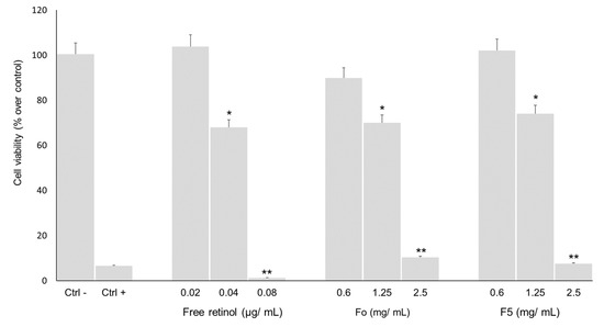Metabolic inhibition of free and encapsulated Retinol CB 50 (Fo and F5) of HaCaT cells. Values show Mean ± SD (N ≥ 3); * p < 0.05; ** p < 0.001 vs. control with p-values obtained using a two-way analysis of variance (ANOVA) with Tukey’s post-hoc test.