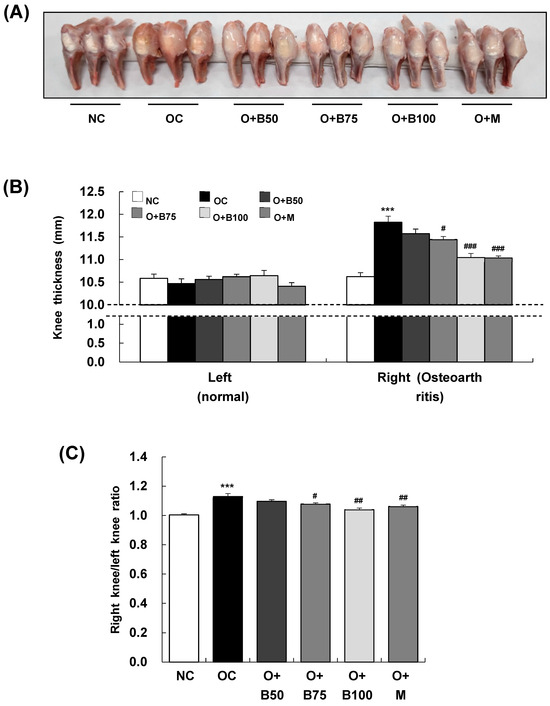 To assess the impact of BSRE on osteoarthritis-induced knee joint swelling, we conducted measurements and sample harvesting 3 weeks post-MIA injection, specifically, on day 21, measuring the thickness of both the right knee joint, where osteoarthritis was induced by MIA injection, and the left knee joint, which remained un-injected, as depicted in Figure 1A. There was no significant difference in the thickness of the left knee joint across all test groups (Figure 1B). However, a notable increase in the thickness of the right knee joint was observed in the osteoarthritis control group (OC) compared to the normal control group (NC) (p < 0.001). Additionally, a significant reduction in thickness was recorded in the osteoarthritis + 75 mg/kg body weight (BW)/day BSRE-treated group (O + B75), osteoarthritis + 100 mg/kg BW/day BSRE-treated group (O + B100), and osteoarthritis + 150 mg/kg BW/day methyl sulfonyl methane (MSM)-treated group (O + M) compared to the OC group (p < 0.05). The ratio of right knee joint thickness to left knee joint thickness, as shown in Figure 1C, was significantly higher in the OC group than in the NC group (p < 0.001). This ratio was notably lower in the O + B75, O + B100, and O + M groups compared to the OC group (p < 0.05).