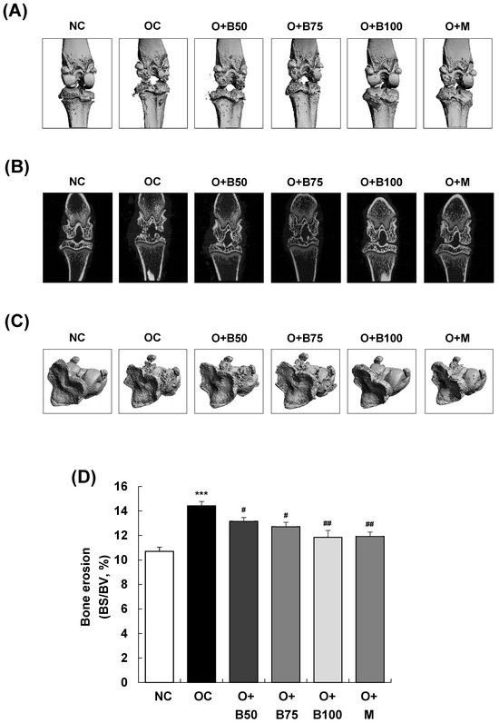Micro-computed tomography (micro-CT) analysis conducted 3 weeks post-MIA injection—specifically, on day 21—was utilized to investigate the effect of BSRE on the femorotibial joint, particularly focusing on the epiphysis of the proximal tibia. Significant knee joint damage was observed in the OC group compared to the NC group, as indicated in Figure 2A,B. However, BSRE (osteoarthritis + 50 mg/kg BW/day BSRE-treated group (O + B50), O + B75 group, and O + B100 group) and MSM (O + M group) significantly mitigated the MIA-induced knee joint damage. In Figure 2C,D, the bone surface/bone volume ratio (BS/BV, %) of the subchondral bone, representing the degree of knee joint area erosion, was significantly higher in the OC group than in the NC group (p < 0.001). Nonetheless, a significant reduction in the BS/BV ratio was observed in the O + B50, O + B75, O + B100, and O + M groups compared to the OC group (p < 0.05).