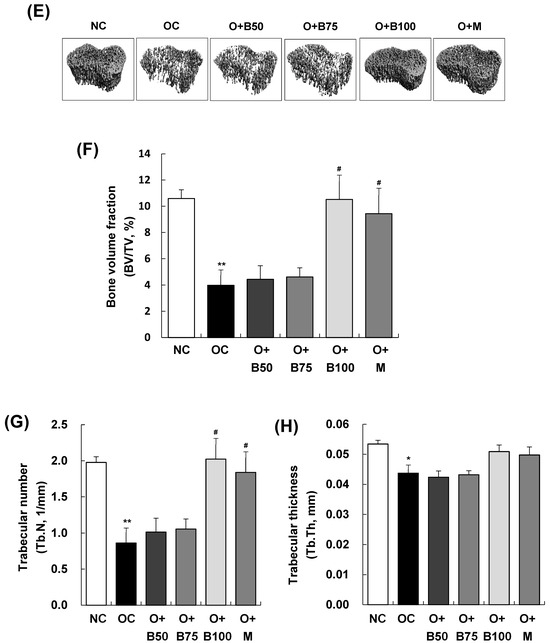 Figure 2E–H depict that the bone volume fraction (bone volume/total volume ratio, BV/TV, %), representing the proportion of cancellous bone within the volume of interest; the trabecular number (Tb.N, 1/mm), indicating the number of cancellous bones per unit length within the volume of interest; and trabecular thickness (Tb.Th, mm) were significantly lower in the OC group than in the NC group (p < 0.001). Notably, in the O + B100 and O + M groups, these parameters did not decrease as in the OC group but remained significantly higher, indicating a protective effect against osteoarthritis-induced bone structure changes (p < 0.05).