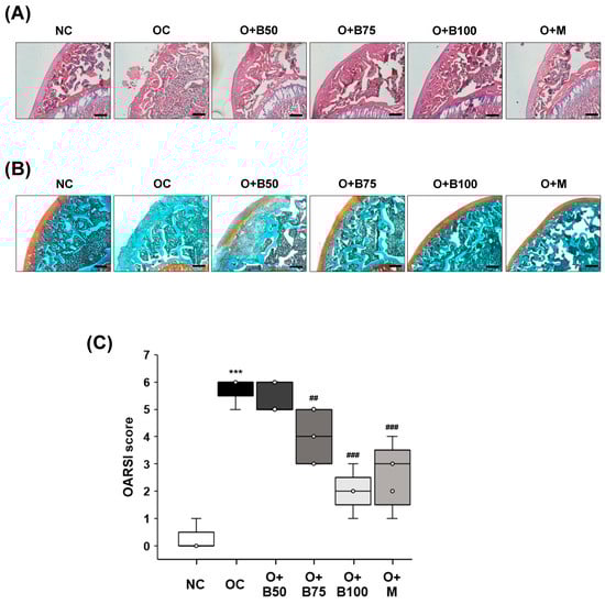 Histomorphological changes in knee joint cartilage were observed through hematoxylin and eosin (H&E) staining, conducted 3 weeks post-MIA injection—specifically, on day 21—as depicted in Figure 3A. The articular cartilage tissue in the NC group exhibited smoothness and preservation with no evident deformation or damage. In contrast, the OC group displayed deformed and damaged cartilage tissue with a worn surface. The administration of BSRE and MSM, notably, in the O + B75, O + B100, and O + M groups, mitigated the cartilage damage, bringing improvement and producing levels comparable to the NC group.